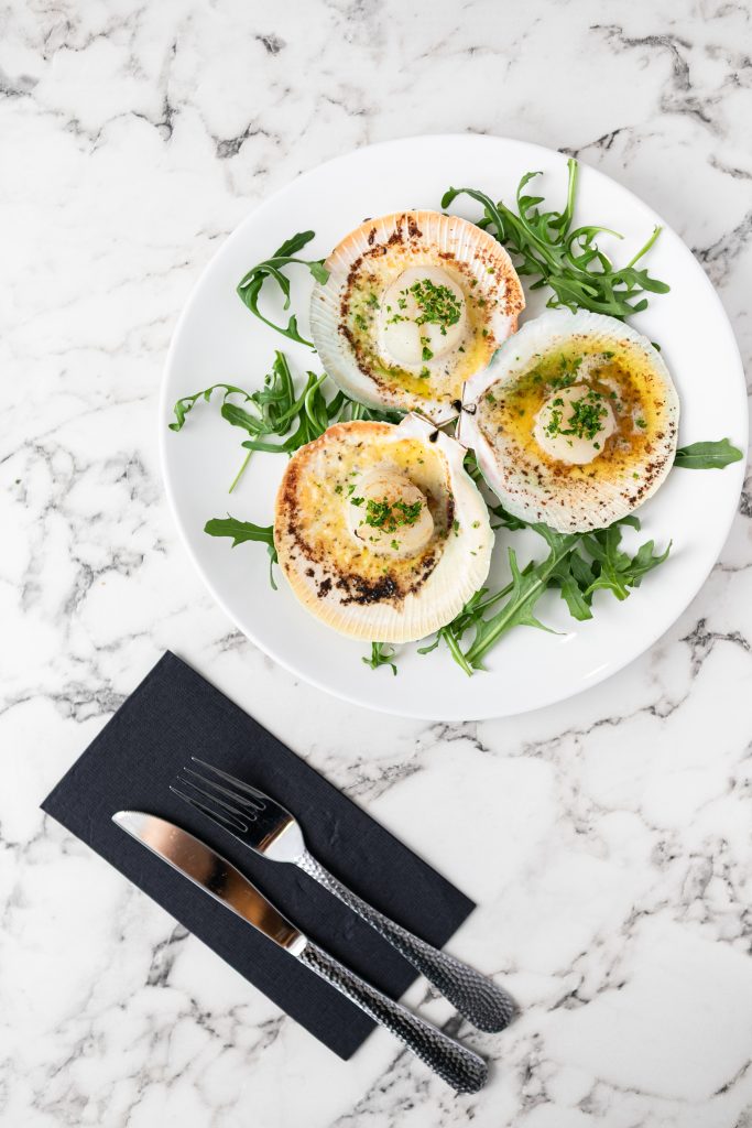 $34Skin-on barramundi, grilled prawns, sweet potato patty, mint and green pea purée